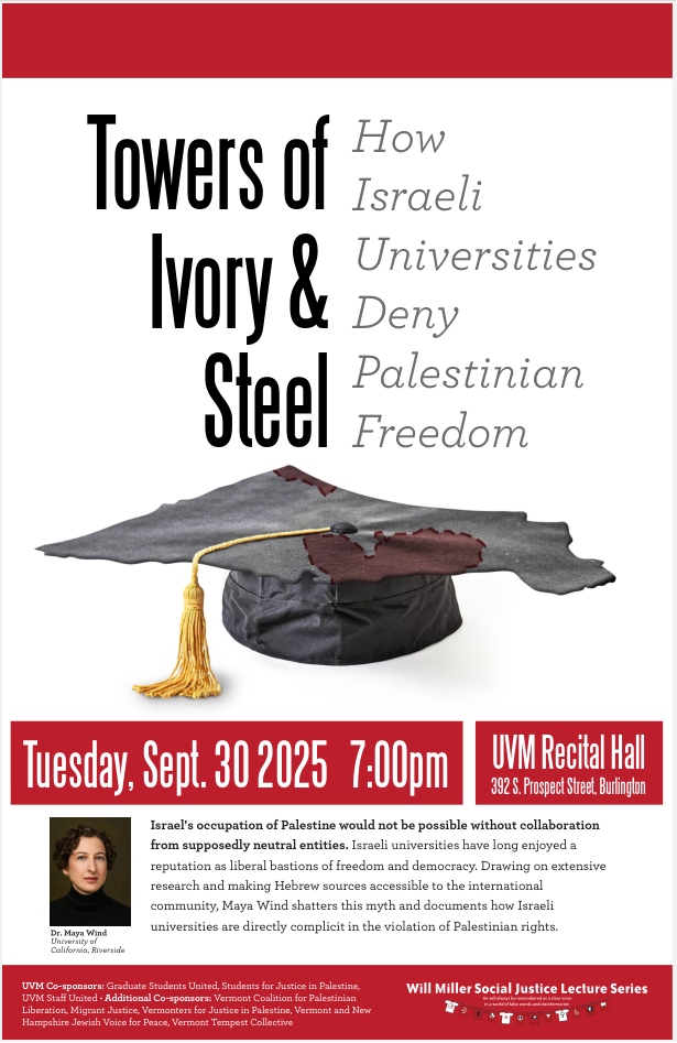 Vermonters for Justice in Palestine; Decolonize Burlington; Jewish Voice for Peace, Vermont-New Hampshire; Community Voices for Immigrant Rights; Red Banner Anti-Imperialist Collective; Party for Socialism and Liberation (PSL); Party of Communists USA; Rise Upper Valley; Education Justice Coalition of Vermont; Vermont Workers’ Center; The Battery Park Movement; Will Miller Social Justice Lecture Series; The Peoples Kitchen; The Center for Grassroots Organizing; VT National Lawyers Guild