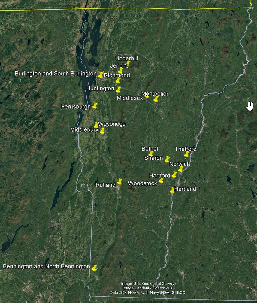 Bethel, Colchester, Ferrisburg, Hartford, Hartland, Huntington, Jericho, Middlebury, Montpelier, North Bennington, Norwich, Middlesex, Richmond, Sharon, South Burlington, Rutland, Thetford, Underhill, Weybridge, Woodstock, Norwich.