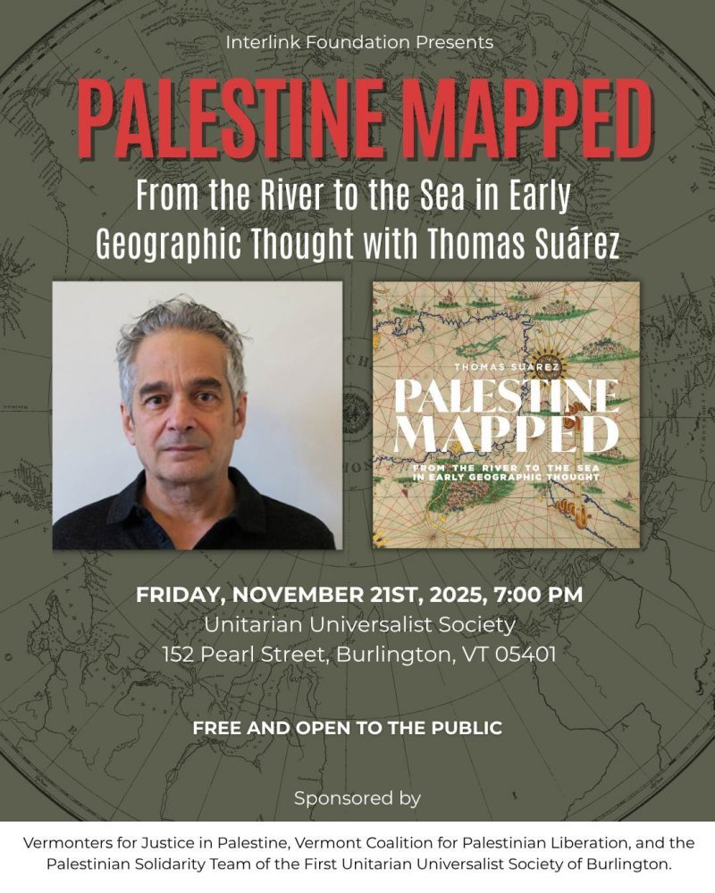 Sponsored by: Vermonters for Justice in Palestine, Vermont Coalition for Palestinian Liberation, and the Palestine Solidarity Team of the First Unitarian Universalist Society of Burlington.