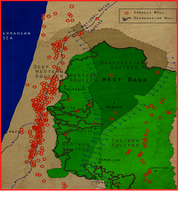 The network of wells to the east of Israel’s 1967 border captures water from the Mountain Aquifer in the occupied West Bank and directs it to Israeli communities. From: “The Human Right to Water in Palestine,” published by LifeSource. It can be accessed at http://www.blueplanetproject.net/documents/RTW/RTW-Palestine-1.pdf.
